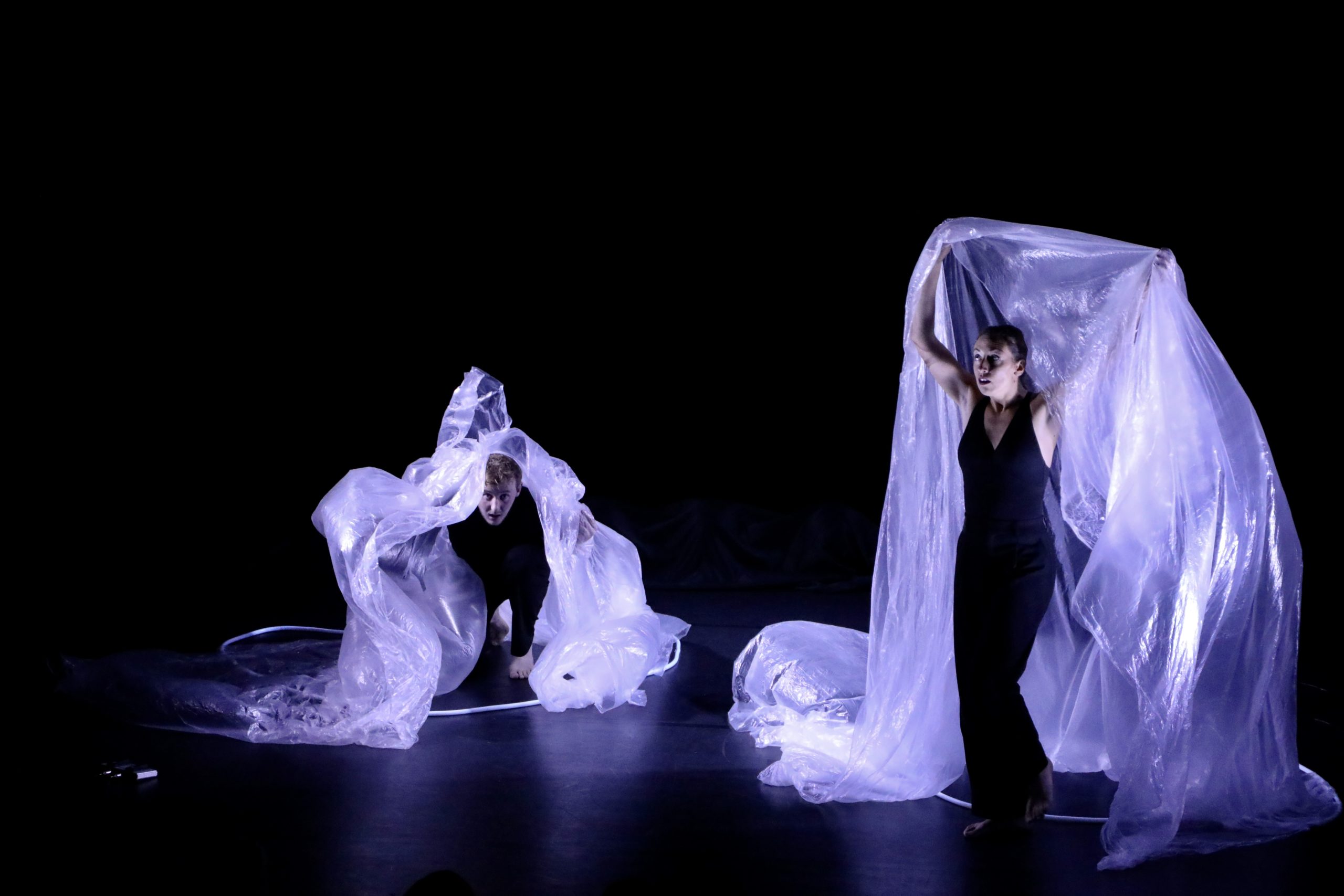 Dans une bulle d’espace et de temps, deux créatures émergent, comme suspendues au souffle de la vie. L’air et les matières rentrent en vibration, participant à l’élaboration d’un langage corporel.